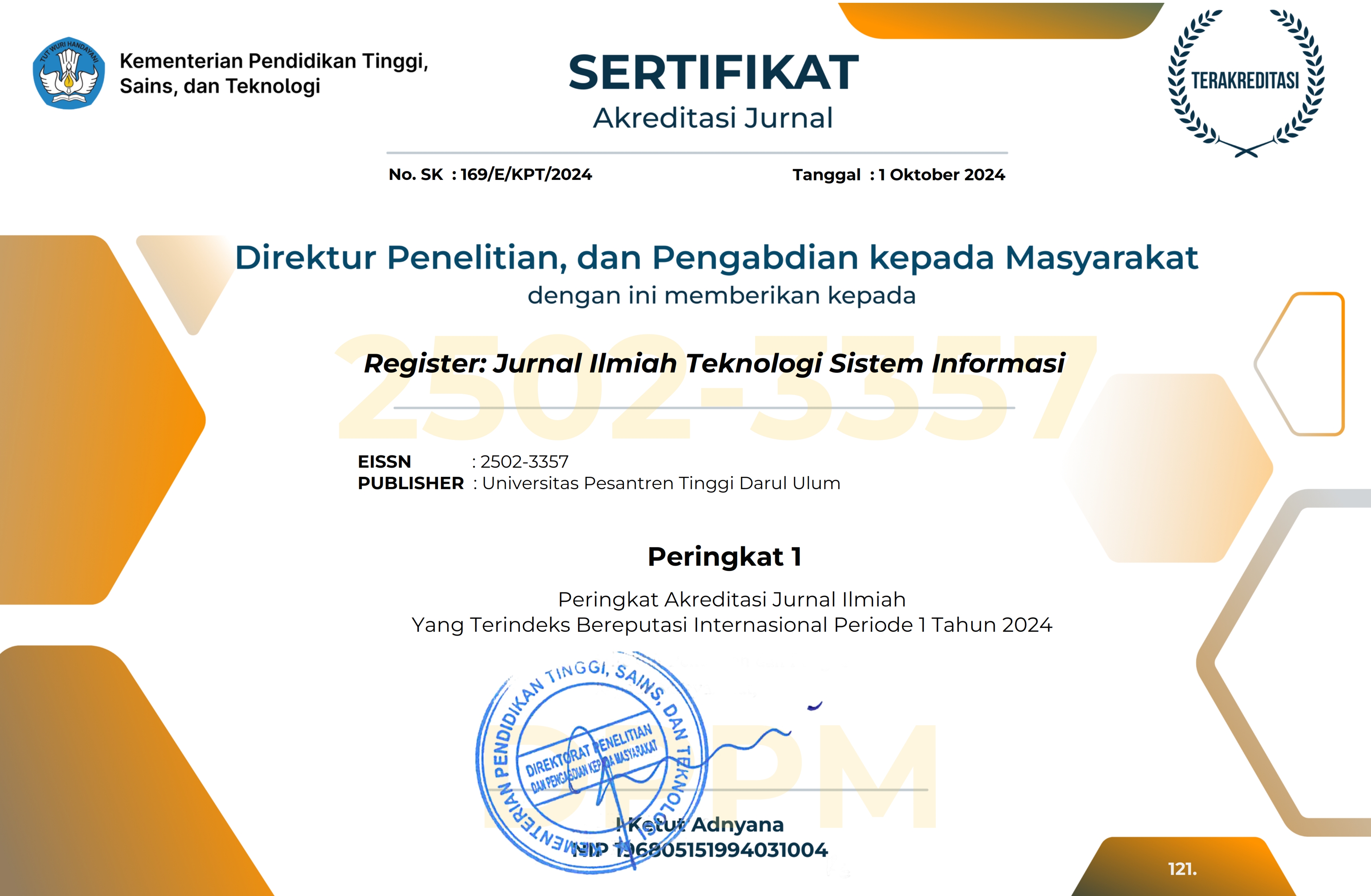 Register: Scientific Journals of Information System Technology is an international, peer-reviewed journal that publishes the latest research results in Information and Communication Technology (ICT). The journal covers a wide range of topics, including Enterprise Systems, Information Systems Management, Data Acquisition and Information Dissemination, Data Engineering and Business Intelligence, and IT Infrastructure and Security. The journal has been indexed on Scopus (reputated international indexed) and accredited with grade “SINTA 1” by the Director Decree (1438/E5/DT.05.00/2024) as a recognition of its excellent quality in management and publication for international indexed journal.